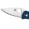 Déverrouillage du liner-lock pour replier le couteau aisément à une main. Lame satinée et dentée de forme Drop point en acier CPM S35VN, logo Spyderco gravé suer la lame.