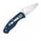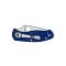 Verrouillage de la lame par linerlock, profil plat. Manche FRN bleu vif (nylon et fibre de verre), d'une texture bidirectionnelle antidérapante.