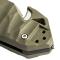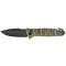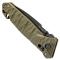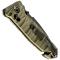 Le manche est constitué de deux plaquettes en polymère chargé de fibres de verre. Ces plaquettes sont vissées à la mécanique par des vis en acier inoxydable dont l'une d'elle loge astucieusement une lame coupe sangle. Cette lame courbe et interchangeable est conçue pour couper des sangles, des cordes et des ceintures de sécurité pour favoriser l'extraction en cas d'accident.