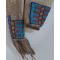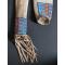 LE CARQUOIS est en peau de bison brodée au lazy stitch de perles de couleur bleu turquoise, rose et jaune formant une sorte de damier en bas et haut du carquois . Franges en peau de bison.