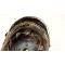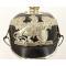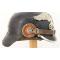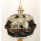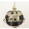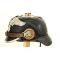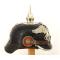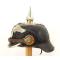 Casque à pointe modèle 1895 du 109e régiment d'infanterie du Grand-Duché de Bade, dit Garde Badoise. Cette unité constituait la garde de l'armée du Grand-Duché de Bade à l'époque de l'Empire allemand. Coiffure portée au début de la 1re guerre mondiale. Bombe en cuir verni, garnitures en maillechort, pointe dévissable. Deux cocardes badoises, coiffe à dents de loup, avec un système d'aération aménagé sur le devant. Pas de marquages régimentaires visibles. H. 22cm, 25 x 18,5cm. Bon état général, usures à la coiffe interne.