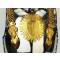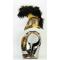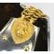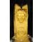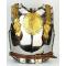 Cimier en laiton doré estampé, composé d'un masque timbré dans le bas des Armes de France surmontées d'une tête de méduse en relief sur fond sablé ; deux ailerons frappés d'une suite décroissante de 13 godrons encadrés de perles et de gouttes séparés par des feuilles d'acanthe, sur fond sablé.