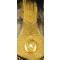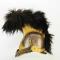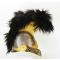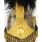 Jugulaires en laiton doré en forme de 8 entrelacés et ciselés montés sur une mentonnière en fer recouvert de fin drap noir ; rosace en laiton doré timbrée d'un soleil rayonnant sur fond sablé, fixée à la bombe au moyen d'une vis à tête ciselée et dorée.