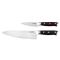 Coffret 2 couteaux FUKITO Ebène X50 (office 9 cm - réf. B13S.SG et chef 21 cm - réf. B13S.CS). Ces couteaux ne vont pas au lave-vaisselle. Les couteaux Ebène X50 sont fabriqués en acier X50CrMoV15 avec une dureté Rockwell de 58 +/- 1. Le manche est en bois d'ébène avec 2 rivets en inox et un rivet central en mosaïque, la mitre est en inox brossé.