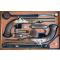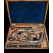 Outre les pistolets le coffret contient : Une boîte à amorce en bois, d’un maillet en bois, d’un huilier, d’un moule à balle au calibre des pistolets (12mm), d’une poire à poudre en forme de pomme de pin, munie de son bec verseur. D’une jauge à poudre. Une aiguille pour déboucher les cheminées. D’un tournevis, faisant également office de clé pour démonter les cheminées. D’une tige munie en son bout d’un pousse balle, ainsi que d’une seconde pourvue d’un tire chiffon en laiton. D’un compartiment pour contenir les balles. Il est muni de sa clé.