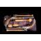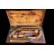 Le coffret contient tous ses accessoires dont : Une poire à poudre, un huilier, un maillet, une tige pousse balle et une tige écouvillon. Un tournevis faisant également office de clé démonte cheminées, une boîte à amorces et deux compartiments, un pour les accesooires brosse (présente) et un autre pour les balles. Le coffret est garni de son vellours d’origine et possède sa clé. Comme souvent, on note la présence d’une fente sur le couvercle qui a été réparée anciennement et est à peine visible. Ce couvercle est également pourvu d’un macaron en cuivre pour y graver ses armoiries ou ses initiales.