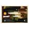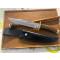 Coffret composé d'un affûteur 11 cm, d'une dague lame fixe Défender (Lame 21.3 cm, manche 12.9 cm) + étui, d'une dague 18 cm pliante avec cran de sécurité (Lame 18 cm, manche 12 cm) + étui ainsi qu'un couteau chasse 11.5 cm pliant avec cran de sécurité (Lame 10 cm, manche 11.5 cm) + étui. Tous marqués LÉOPARD (sauf l'affûteur)