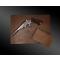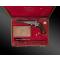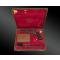 Coffret en bois, entièrement recouvert de cuir, chiffré SC couronné sur le dessus. L’intérieur est garni de feutre rouge, marqué à l’or N. GUYOT ARMURIER, 12 RUE DE PONTHIEU PARIS. Il est garni d’une boite à cartouches en cuir portant le monogramme SC couronné, baguette, tournevis, huilier.