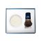 Coffret rasage PLISSON comprenant : - un blaireau « ESSENTIEL », pur Gris de Russie (taille 12), monture bleu nuit (réf. 955801) et son support. - Bol à barbe porcelaine, avec savon (réf. C921.1).