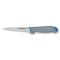 Couteau à désosser Fischer avec lame 11 cm en acier inoxydable Sandvik 12C27. Dureté 56-57 HRC pour une robustesse accrue. Manche bleu ergonomique et hygiénique, adapté à toutes les mains. Tranchant durable et affûtage simplifié. Idéal pour des découpes précises avec un entretien minimal.