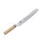 Couteau à pain Shun Classic White, lame 23 cm. Ne va pas au lave-vaisselle. La gamme Shun Classic White est une déclinaison de la série Shun Classic avec un manche en lamelles de pakka compressé couleur frêne. Les couteaux professionnels Shun sont fabriqués en acier damas inox composé de 32 couches et d'un noyau central en acier VG-10. Cet acier très dur, particulièrement résistant à la corrosion, possède une dureté Rockwell de 61 +/- 1. Le tranchant convexe de la lame ainsi que l'affûtage manuel de chaque couteau Shun garantissent une coupe remarquable. La beauté du manche est rehaussée par une mitre en bout.