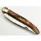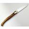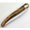 Couteau ligne Laguiole fait main * Lame en acier Sandvik 12C27 / 100 mm - coupe rasoir * Platines et mitre en laiton - cotes en racine de buis * Trèfle forgé dans la masse du ressort (en acier inox) * Ouvert 217 mm - fermé 120 mm - 80 g * Pièce unique - coutellerie d'Île de France * Pas de jeu - ressort efficace + poncète de protection du tranchant