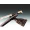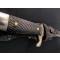 Couteau baïonnette type modèle KS98 dite 'de sortie', poignée fer nickelée à pommeau en forme de tête d'aigle, verrou fonctionnel avec feutrine verte de protection dans le canal. Plaquettes en gutta-percha noire. Lame droite et plate, finition d'origine nickelée, gousset en cuir verni pour le port au ceinturon, monté d'origine. Fourreau fer laqué noir, patiné. L. totale 35cm