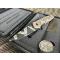 La lame de 4 mm d'épaisseur est dotée d'une pointe en pointe de lance à affûtage asymétrique, les dents permettent de couper câbles et tissus très résistants tout en préservant le tranchant. La finition est caractérisée par la personnalisation Geotech Camo, le motif de camouflage innovant et original Extrema Ratio, créé par gravure laser.