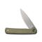 Couteau CIVIVI « STYLUM », lame acier 10Cr15CoMoV finition « stonewashed » avec « front flipper », mécanisme « Ball bearing » à cran « slip joint », manche 10 cm acier inox gris avec plaquettes micarta vert olive et entretoise G10 noir, avec clip. Livré avec pochette nylon noir.