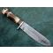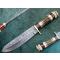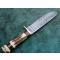 Très belle réalisation pour ce couteau de chasse Damas, manche en bois de cerf et laiton, talon et garde en laiton.