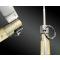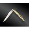 Lame courbe, en acier, à un tranchant, à talon plat tourillonné ; marquée sur un côté des initiales JS. Déblocage par anneau ciselé, monté sur le ressort.
