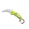 Couteau FOX « RESCUE KARAMBIT », lame Hawkbill semi-dentée à trou acier N690Co satiné à cran intérieur avec système de blocage LAWKS, manche 10 cm (12 cm avec anneau) G10 jaune fluorescent, avec clip et mousqueton sur l'anneau. Pic brise-vitre en bout et tournevis Torx sur le crochet.
