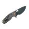 Couteau FOX « SURU », lame à trou acier M390 Bohler avec « flipper » et cran intérieur, manche à trous 9 cm titanium. Revêtement PVD noir. Clip, entretoise, pivot et vis titanium anodisé bronze. Livré avec étui cuir/nylon noir. Design : Vox.