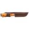 Le manche en rondelles de cuir après un petit traitement à la cire d'abeille lui rendra on étanchéité et sa patine. Pour le fourreau une petite restauration et il serra parfait, le cuir gras est de très bonne qualité. En bref un bon couteau, avec helle on ne se trompe pas sur la qualité.