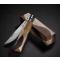 Son manche est fait avec du wengé, du palissandre, du noyer et du frêne. Il constitue la pièce maîtresse du couteau : réalisé en bois et sublimé par un décor en marqueterie, il met en valeur un travail minutieux d’assemblage d’essences de bois contrastées formant un motif inspiré de l’univers alpin. Cette composition confère à chaque couteau un caractère unique et élégant, tout en conservant une prise en main confortable et ergonomique.