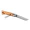 L'Opinel n°10, best-seller de la collection, évolue et adapte un nouvel accessoire indispensable pour ouvrir les bouteilles de bière et autres bouteilles à capsules. Situé en bout de manche, l'anneau en en acier a deux fonction : décapsuler des bouteilles et permettre à accrocher ou suspendre le couteau.