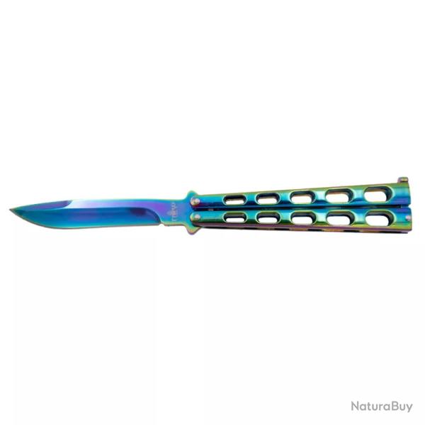 Couteau papillon Third avec lame de 11 cm en acier 420 finition rainbow arc-en-ciel brillant, manche inox finition arc-en-ciel brillant.