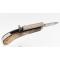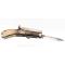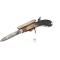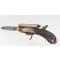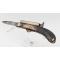 Couteau pistolet Unwin & Rodgers à Sheffield, circa 1850 Cal. .32 à percussion. sans, canon octogonal lisse en maillechort avec double poinçon de tir sur le dessus du canon. Mécanisme en fer avec chien central et détente à clapet. Pièces en fer patinées. En dessous, deux lames de couteau à ressort, estampillées à la base respectivement "UNWIN & ROGER Sheffield". Poignée à plaquettes en corne bovine. Dans la poignée, un compartiment pour les balle et une sorte de pince positionné latéralement. TBE Angleterre XIXè, belle patine sans usure particulière.