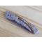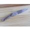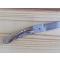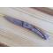 Couteau pliant Artisanal automatique, lame damas inox VG10, 93 x 21 x 3mm, pivot inox trempé Ø4mm M3 sur bagues de calage bronze/béryllium. Platines, fausse pièce guillochée (avec passe lacet) et ressort: Titane qualité aéronautique TA6V Grade 5. Mitres et palette Titane Cristal, visserie Titane, manche: défense de Mammmouth stabilisée teintée sur G10 noir, visserie invisible inox.