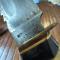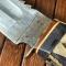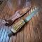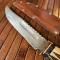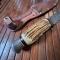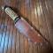 Manche bois de cerf et rondelles de cuir , pommeau aluminium, garde laiton , lame à dos de scie marquages bien lisible .