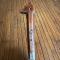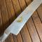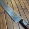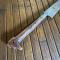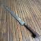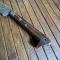 Manche en bois dur à profile de canidé, soie à 3/4 , belle lame très tranchante à gravures et incrustation de laiton , légèrement courbe