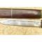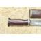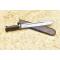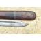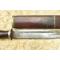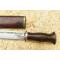 La lame de 21.5 cm comporte un tranchant et un dos plat, petit décor à motifs ondulés, elle est dans une petite patine grise. Petit accident à la pointe.