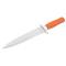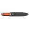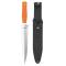 Ce couteau traditionnel de chasse au sanglier présente une lame à double tranchant avec une finition satinée. Il dispose d'une gouttière de sang et d'un ricasso large pour optimiser son efficacité. La garde en acier inoxydable assure une protection durable et fiable. Le manche est en G10, un matériau reconnu pour sa robustesse et sa prise en main confortable. Un trou pour dragonne est intégré. Livré avec un étui en cuir
