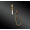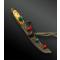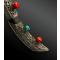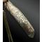 Fourreau en bois gainé de deux empiècements en argent gravé de motifs en volutes, d’une section de peau et rythmé de trois cabochons : deux de corail et un de turquoise.