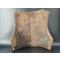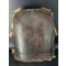Cuirasse d'officier monté en fer gravée, empreinte de tir d'épreuve sur le plastron. Riche décor de motifs géométriques et floraux en fins pointillés, poinçonnée I-LEBRUN. Restes de matelassure sur la partie dorsale en gros lin recouvert de soie avec des manches en velours jaune et bordure de galon argenté. Une bretelle est en cuir recouvert du même velours à bordure à galon argenté. Reste de peinture noire, manque deux rivets au plastron. Poids total 16 kg. Rare dans cet état. Fabrication de Besançon vers 1680 - France époque Louis XIV
