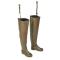 Les bottes comportent des renforts au niveau du talon, de la pointe et du coup du pied, ce qui assure un bon maintien pendant les déplacements. La couleur verte de ces cuissardes en caoutchouc naturel permet de se rendre discret à la fois sur les bordures mais aussi dans l'eau. L'utilisation de semelle crantée garantit une bonne accroche sur les sols boueux qui peuvent être glissants, mais aussi sur les cailloux et rochers pas toujours très stables.