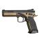 L'arme est livrée dans une superbe mallette contenant 3 chargeurs 20 coups, une chargette, un nécessaire d'entretien, un calepin, clés BTR et toutes sortes de pièces de rechange (ressorts de différents tarages, etc...). Le look de cette arme avec revêtement Cerakote Bronze, canon poli et plaquettes alu quadrillées est superbe. Le poids est conséquent (1.3 kg) mais indispensable a un enchaînement rapide des coups sans perte de la visée. La prise en main est excellente, le repose pouce et les leviers de sécurité ambidextres bien placés, bouton de chargeur assez proéminent pour un changement de chargeur ultra-rapide dans la course. Les organes de visé sont d'une netteté parfaite pour un tir instinctif, la hausse réglable est dans un logement fraisé dans la carcasse afin de réduire la hauteur pour une visée flat.