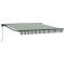 Cadre d'auvent Vert et blanc 300 x 250 cmCe store rétractable propose de l'ombre pratique pour des espaces extérieurs comme les jardins et terrasses. Il s'étend ou se rétracte facilement pour moduler la lumière du soleil et l'abri selon vos besoins. Idéal pour des repas en plein air, se détendre ou recevoir des amis, il rend l'environnement plus agréable en protégeant du soleil direct et de la pluie légère. Le store est un super ajout pour profiter au max de votre extérieur tout au long de l'année. Matériaux durables : Fabriqué avec du polyester enduit de PU pour résister aux intempéries. Le cadre en acier et aluminium revêtu de poudre garantit un support stable pour un usage quotidien dehors. Fonctionnement ajustable : Le store peut être actionné avec une manivelle manuelle ou à distance, offrant une grande flexibilité selon vos besoins d'ombre. Structure semi-cassette : Conçu avec des bras rétractables et un rouleau en aluminium pour un déploiement facile et un rangement pratique tout en protégeant le tissu quand c'est replié. Ombre extérieure : Parfait pour patios, jardins et terrasses, le mécanisme rétractable permet d'ajuster la zone d'ombre en fonction du soleil. Exigences d'installation : Conçu pour un montage mural, il nécessite des outils de base comme un tournevis, une perceuse et une pince. Suivez bien les instructions pour réussir l'assemblage et la mise en place. Danger ! Ressort fort lors de l'ouverture. Ne retirez pas cette corde si vous n'avez pas terminé toutes les étapes d'assemblage avec tous les boulons fixés et l'article fixé au mur ! Avertissement! Faire attention en desserrant les bras, car ils sont sous tension ! Un relâchement soudain du bras d'un auvent à bras articulés peut provoquer des blessures. Avertissement : Les instructions d'utilisation doivent être lues avant d'utiliser le produit. Avertissement: Le fonctionnement dans des conditions de gel peut endommager le produit. Utilisation externe dans les bâtiments et autres travaux de construction. Ne laissez pas les enfants jouer avec le dispositif de commande du store. Gardez la télécommande hors de portée des enfants.