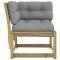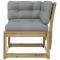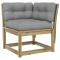 Canapé d'angle de jardin avec coussins bois de pin imprégné Ce canapé de jardin en bois avec coussins sera un excellent complément à votre jardin, terrasse ou patio pour discuter avec la famille et les amis ou simplement profiter du temps. Bois imprégné : le bois de pin massif est un matériau naturel magnifique. Le bois de pin a un grain droit et les noeuds lui confèrent un aspect rustique caractéristique. L'imprégnation est un processus de conservation réalisé à l'aide d'autoclaves. Le traitement sous pression augmente la résistance à la pourriture et aux intempéries. Expérience d'assise confortable : le dossier et les coussins rendent le canapé de jardin plus confortable pour s'asseoir. Conception à lattes : la conception à lattes du canapé d'extérieur empêche efficacement l'eau de s'accumuler, ce qui garantit que l'assise reste sèche et exempte de tout risque de pourriture. Conception modulaire : ce canapé simple présente une conception modulaire, ce qui le rend complètement flexible et facile à déplacer pour s'adapter à n'importe quel environnement. Vous pouvez le combiner avec d'autres segments modulaires disponibles dans le menu déroulant pour créer vos propres configurations d'ensemble de salon de jardin personnelles ! Bon à savoir : Pour que vos meubles d'extérieur restent beaux, nous vous recommandons de les protéger avec une housse imperméable. Maximum 110 kg par siège.