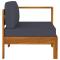 Canapé central avec 1 accoudoir Gris foncé Acacia solideCe canapé central allie style et fonctionnalité et est conçu pour l'extérieur toute l'année. Ce canapé de jardin est en bois d'acacia massif, un bois dur aux grains denses. Le canapé magnifiquement conçu est stable, durable et accrocheur. De plus, le savoir-faire exquis et les beaux grains de bois rendent chaque pièce légèrement différente l'une de l'autre. Vous pouvez placer votre bras sur l'accoudoir. Les coussins bien rembourrés offrent un confort optimal. Vous pouvez le combiner avec d'autres meubles pour créer vos configurations personnelles de salon de jardin ! Remarque : afin de prolonger la durée de vie de vos meubles d'extérieur, nous vous recommandons de les nettoyer régulièrement et de ne pas les laisser à l'extérieur sans protection inutilement. Nettoyage : Utiliser une solution savonneuse douce. Stockage : si possible, stockez dans un endroit frais et sec à l'intérieur. Si le produit est stocké à l'extérieur, protégez-le avec une housse imperméable. Essuyez et séchez l'excès d'eau ou de neige des surfaces planes après la pluie ou une chute de neige. Permettez une circulation d'air suffisante afin d'éviter les dommages liés à l'humidité. ,