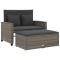 Canapé de jardin 2 places avec coussins gris résine tresséeDétendez-vous et profitez de l'extérieur dans ce confortable canapé de jardin 2 places ! Matériau durable : la résine tressée, également connue sous le nom de poly rotin, est un matériau synthétique solide et nécessitant peu d'entretien qui ressemble au rotin naturel. Il est léger, facile à nettoyer et couramment utilisé pour les meubles d'extérieur en raison de sa durabilité et de ses propriétés de résistance aux intempéries. Fonctionnalité polyvalente : ce meuble d'extérieur peut être utilisé comme banc à 2 places ou comme canapé-lit. Vous pouvez facilement le transformer en lit en inclinant le dossier et en retirant le tabouret qui se trouve sous la banquette. Les panneaux de support situés derrière les dossiers rendent le lit plus stable. Repose-pieds polyvalent : le repose-pieds d'extérieur peut être utilisé pour vous asseoir ou vous détendre, et peut également être utilisé comme table basse pour contenir vos boissons, votre nourriture et d'autres décorations. De plus, le repose-pieds est doté d'une fonction de rangement pour les coussins et les oreillers et peut être soigneusement rangé sous le canapé pour économiser de l'espace. Expérience d'assise confortable : ce mobilier d'extérieur, doté de coussins épais, offre une expérience d'assise confortable. Housse amovible et lavable : ces coussins de siège sont dotés de housses amovibles pour un lavage et un entretien faciles. Bon à savoir :Pour que vos meubles d'extérieur restent beaux, nous vous recommandons de les protéger avec une housse imperméable. Maximum 110 kg par siège. Soyez conscient du risque de feux ouverts et d'autres sources de forte chaleur à proximité du produit.