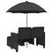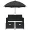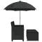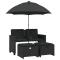 Canapé de jardin 2 places avec parasol et tabourets noir rotinCe canapé de jardin avec parasol et repose-pieds est le complément parfait à votre jardin, terrasse ou patio, offrant un espace confortable et invitant pour discuter avec la famille et les amis ou simplement se détendre et profiter du jardin. Matériau durable : la résine tressée, également connue sous le nom de poly rotin, est un matériau synthétique solide et nécessitant peu d'entretien qui ressemble au rotin naturel. Elle est légère, facile à nettoyer et couramment utilisée pour les meubles d'extérieur en raison de sa durabilité et de ses propriétés de résistance aux intempéries.Parasol pratique : le canapé de jardin est équipé d'un parasol avec un mécanisme d'inclinaison qui vous permet d'ajuster facilement l'auvent pour obtenir une ombre et une protection optimales contre le soleil.Housse amovible et lavable : ces coussins sont dotés de housses amovibles pour un lavage et un entretien faciles.Rangement compact : ces repose-pieds peuvent être soigneusement rangés sous les sièges, ce qui permet d'économiser de l'espace.Cadre robuste et stable : le cadre en acier enduit de poudre assure la solidité et la stabilité du meuble de jardin pour une utilisation quotidienne à l'extérieur. Bon à savoir :Pour que vos meubles d'extérieur restent beaux, nous vous recommandons de les protéger avec une housse imperméable.