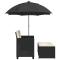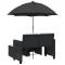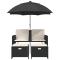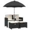 Canapé de jardin 2 places avec parasol et tabourets noir rotinCe canapé de jardin avec parasol et repose-pieds est le complément parfait à votre jardin, terrasse ou patio, offrant un espace confortable et invitant pour discuter avec la famille et les amis ou simplement se détendre et profiter du jardin. Matériau durable : la résine tressée, également connue sous le nom de poly rotin, est un matériau synthétique solide et nécessitant peu d'entretien qui ressemble au rotin naturel. Elle est légère, facile à nettoyer et couramment utilisée pour les meubles d'extérieur en raison de sa durabilité et de ses propriétés de résistance aux intempéries.Parasol pratique : le canapé de jardin est équipé d'un parasol avec un mécanisme d'inclinaison qui vous permet d'ajuster facilement l'auvent pour obtenir une ombre et une protection optimales contre le soleil.Housse amovible et lavable : ces coussins sont dotés de housses amovibles pour un lavage et un entretien faciles.Rangement compact : ces repose-pieds peuvent être soigneusement rangés sous les sièges, ce qui permet d'économiser de l'espace.Cadre robuste et stable : le cadre en acier enduit de poudre assure la solidité et la stabilité du meuble de jardin pour une utilisation quotidienne à l'extérieur. Bon à savoir :Pour que vos meubles d'extérieur restent beaux, nous vous recommandons de les protéger avec une housse imperméable.