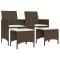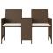 Canapé de jardin 2 places avec table et tabourets marron rotinDétendez-vous et profitez de l'extérieur dans ce confortable canapé de jardin ! Matériau durable : la résine tressée, également connue sous le nom de poly rotin, est un matériau synthétique solide et nécessitant peu d'entretien qui ressemble au rotin naturel. Il est léger, facile à nettoyer et couramment utilisé pour les meubles d'extérieur en raison de sa durabilité et de ses propriétés de résistance aux intempéries.Pouf polyvalent : le tabouret est polyvalent, servant de repose-pieds confortable lorsque vous vous prélassez sur le canapé ou de siège supplémentaire dans votre jardin.Expérience d'assise confortable : ce mobilier d'extérieur, doté de coussins épais, offre une expérience d'assise confortable.Housse amovible et lavable : ces coussins de siège sont dotés de housses amovibles pour un lavage et un entretien faciles.Cadre robuste et stable : le cadre en acier enduit de poudre assure la solidité et la stabilité du meuble de jardin pour une utilisation quotidienne à l'extérieur. Bon à savoir :Pour que vos meubles d'extérieur restent beaux, nous vous recommandons de les protéger avec une housse imperméable. Maximum 110 kg par siège. Soyez conscient du risque de feux ouverts et d'autres sources de forte chaleur à proximité du produit.