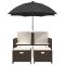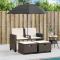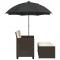 Canapé de jardin 2 places et parasol et tabourets marron rotinCe canapé de jardin avec parasol et repose-pieds est le complément parfait à votre jardin, terrasse ou patio, offrant un espace confortable et invitant pour discuter avec la famille et les amis ou simplement se détendre et profiter du jardin. Matériau durable : la résine tressée, également connue sous le nom de poly rotin, est un matériau synthétique solide et nécessitant peu d'entretien qui ressemble au rotin naturel. Elle est légère, facile à nettoyer et couramment utilisée pour les meubles d'extérieur en raison de sa durabilité et de ses propriétés de résistance aux intempéries.Parasol pratique : le canapé de jardin est équipé d'un parasol avec un mécanisme d'inclinaison qui vous permet d'ajuster facilement l'auvent pour obtenir une ombre et une protection optimales contre le soleil.Housse amovible et lavable : ces coussins sont dotés de housses amovibles pour un lavage et un entretien faciles.Rangement compact : ces repose-pieds peuvent être soigneusement rangés sous les sièges, ce qui permet d'économiser de l'espace.Cadre robuste et stable : le cadre en acier enduit de poudre assure la solidité et la stabilité du meuble de jardin pour une utilisation quotidienne à l'extérieur. Bon à savoir :Pour que vos meubles d'extérieur restent beaux, nous vous recommandons de les protéger avec une housse imperméable.