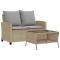 Canapé de jardin 2places coussins et table beige résine tresséeDétendez-vous et profitez de l'extérieur dans ce confortable canapé de jardin 2 places ! Matériau durable : la résine tressée, également connue sous le nom de poly rotin, est un matériau synthétique solide et nécessitant peu d'entretien qui ressemble au rotin naturel. Elle est légère, facile à nettoyer et couramment utilisée pour les meubles d'extérieur en raison de sa durabilité et de ses propriétés de résistance aux intempéries.Dessus en verre : le dessus de la table d'extérieur est fabriqué en verre trempé solide et durable, ce qui le rend facile à nettoyer avec un chiffon humide et ajoute une touche d'élégance à votre espace extérieur.Expérience d'assise confortable : ce mobilier d'extérieur, doté de coussins épais, offre une expérience d'assise confortable.Housse amovible et lavable : ces coussins de siège et oreillers sont dotés de housses amovibles pour un lavage et un entretien faciles.Cadre robuste et stable : le cadre en acier enduit de poudre assure la solidité et la stabilité du meuble de jardin pour une utilisation quotidienne à l'extérieur. Bon à savoir :Pour que vos meubles d'extérieur restent beaux, nous vous recommandons de les protéger avec une housse imperméable.