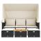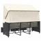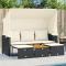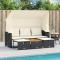 Canapé de jardin 3 places avec auvent et tabourets noir rotinCe canapé de jardin avec auvent et tabourets est le complément parfait de votre arrière-cour, terrasse ou patio, offrant un espace confortable et accueillant pour discuter avec la famille et les amis ou simplement vous détendre et profiter de l'extérieur. Matériau durable : la résine tressée, également connue sous le nom de poly rotin, est un matériau synthétique solide et nécessitant peu d'entretien qui ressemble au rotin naturel. Il est léger, facile à nettoyer et couramment utilisé pour les meubles d'extérieur en raison de sa durabilité et de ses propriétés de résistance aux intempéries.Auvent rétractable : grâce à l'auvent rétractable, vous pouvez créer un environnement extérieur frais et agréable tout au long de la journée.Dessus stable et facile à nettoyer : cette table de jardin a un dessus en bois d'acacia robuste, durable et facile à nettoyer avec un chiffon humide.Housse amovible et lavable : ces coussins de siège sont dotés de housses amovibles pour un lavage et un entretien faciles.Rangement compact : ces repose-pieds et la table peuvent être soigneusement rangés sous le canapé de jardin, ce qui permet d'économiser de l'espace. Bon à savoir :Pour que vos meubles d'extérieur restent beaux, nous vous recommandons de les protéger avec une housse imperméable.