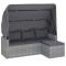 Canapé de jardin 3 places avec toit et repose-pieds GrisCe confortable canapé de jardin 3 places avec toit et repose-pieds est une combinaison parfaite de style et de fonctionnalité. Matériau durable : la résine tressée, également connue sous le nom de rotin poly, résiste aux intempéries et est facile à nettoyer. Elle reste belle à l'extérieur pendant une longue période. Elle est plus économique que d'autres matériaux, tout en offrant une excellente qualité, une commodité et un aspect esthétique.Toit pliable : vous pouvez facilement régler le toit en fonction de vos besoins. Ouvrez le toit pour profiter de la lumière du soleil et fermez-le pour vous détendre à l'ombre. Il bloque efficacement les rayons UV nocifs et protège votre peau délicate des coups de soleil.Cadre stable : le cadre en acier enduit de poudre assure la robustesse et la stabilité.Repose-pieds pratique : le tabouret est adapté pour reposer vos pieds lorsque vous vous allongez sur le canapé ou vous offrir un siège supplémentaire.Expérience de siège confortable : le canapé de jardin est très confortable avec le coussin de siège et de dossier bien rembourré. Bon à savoir :Pour faciliter au maximum le montage, chaque produit est livré avec des instructions. Remarque :Pour que vos meubles d'extérieur restent beaux, nous vous recommandons de les protéger avec une housse imperméable.