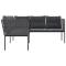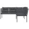 Canapé de jardin avec coussins forme de L noir acier textilèneCe canapé de jardin en forme de L est le complément parfait de votre jardin, terrasse ou patio, offrant un espace confortable et accueillant pour discuter avec la famille et les amis ou simplement se détendre et profiter de l'extérieur. Cadre robuste et stable : le cadre en acier enduit de poudre assure la solidité et la stabilité du meuble de jardin pour une utilisation quotidienne à l'extérieur.Durable et longue durée de vie : le tissu textilène est apprécié pour sa durabilité, résistance à l'eau et à la décoloration, facilité d'entretien et protection contre les rayons UV et la moisissure, ce qui en fait un choix idéal pour le meuble d'extérieur et les structures d'ombrage.Expérience d'assise confortable : ce mobilier d'extérieur, doté de coussins épais, offre une expérience d'assise confortable.Housse amovible et lavable : ces coussins de siège sont dotés de housses amovibles pour un lavage et un entretien faciles. Bon à savoir :Pour que vos meubles d'extérieur restent beaux, nous vous recommandons de les protéger avec une housse imperméable. Maximum 110 kg par siège. Soyez conscient du risque de feux ouverts et d'autres sources de forte chaleur à proximité du produit.