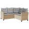 Canapé de jardin avec table et coussins en forme de L beigeCe canapé de jardin en forme de L est le complément parfait de votre jardin, terrasse ou patio, offrant un espace confortable et accueillant pour discuter avec la famille et les amis ou simplement se détendre et profiter de l'extérieur. Matériau durable : la résine tressée, également connue sous le nom de poly rotin, est un matériau synthétique solide et nécessitant peu d'entretien qui ressemble au rotin naturel. Elle est légère, facile à nettoyer et couramment utilisée pour les meubles d'extérieur en raison de sa durabilité et de ses propriétés de résistance aux intempéries. Expérience d'assise confortable : ce mobilier d'extérieur, doté de coussins épais, offre une expérience d'assise confortable. Dessus en verre : le dessus de la table d'extérieur est fabriqué en verre trempé solide et durable, ce qui le rend facile à nettoyer avec un chiffon humide et ajoute une touche d'élégance à votre espace extérieur. Housse amovible et lavable : ces coussins de siège sont dotés de housses amovibles pour un lavage et un entretien faciles. Cadre robuste et stable : le cadre en acier enduit de poudre assure la solidité et la stabilité du meuble de jardin pour une utilisation quotidienne à l'extérieur. Bon à savoir : Pour que vos meubles d'extérieur restent beaux, nous vous recommandons de les protéger avec une housse imperméable.